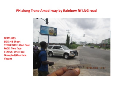 PH along Trans-Amadi way by Rainbow ftf LNG road FEATURES SIZE: 48 Sheet STRUCTURE: One Pole FACE: Two face STATUS: One Face Occupied/One face Vacant