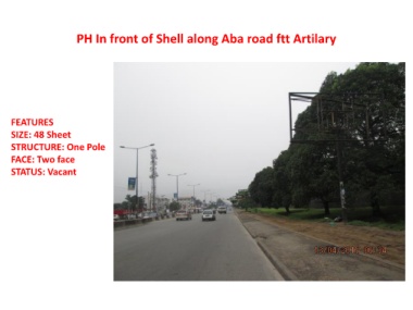 PH In front of Shell along Aba road ftt Artilary FEATURES SIZE: 48 Sheet STRUCTURE: One Pole FACE: Two face STATUS: Vacant