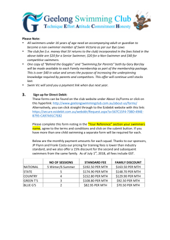 These forms can be found on the club website under About Us/Forms or click on this hyperlink: http://www.geelongswimmingclub.com.au/about-us/forms/ Alternatively, you can click straight through to the Ezidebit website with this link: https://secure.ezidebit.com.au/webddr/Request.aspx?a=567C15F4-73BD-494E- B795-CA97A91C7E82
