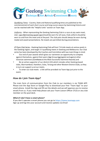Qualifying Times - Country, State and National qualifying times are published at the commencement of each short course and long course season by Swimming Victoria and can be reached with the "Helpful Links" section on Team App.