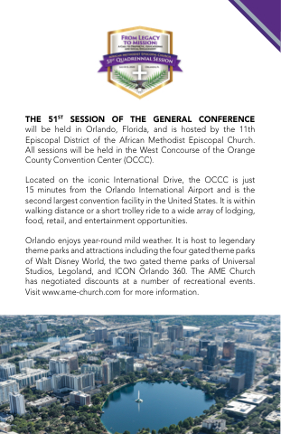 will be held in Orlando, Florida, and is hosted by the 11th Episcopal District of the African Methodist Episcopal Church. All sessions will be held in the West Concourse of the Orange County Convention Center (OCCC).