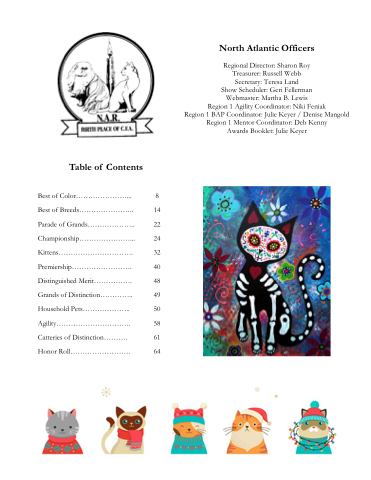 Best of Color........................ 8 Best of Breeds....................... 14 Parade of Grands.................... 22 Championship........................ 24 Kittens............................... 32 Premiership......................... 40 Distinguished Merit................ 48 Grands of Distinction.............. 49 Household Pets.................... 50 Agility............................... 58 Catteries of Distinction.......... 61 Honor Roll......................... 64