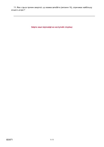 11. Яка з трьох причин смертей, що можна запобігти (питання 10), спричинає найбільшу кількість втрат? ____________________________________________________________________________ Звірте ваші відповіді на наступній сторінці. IS0871 1-11