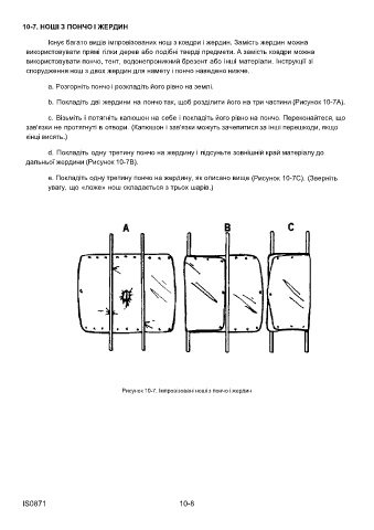 спорудження нош з двох жердин для намету і пончо наведено нижче.