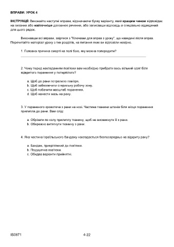 3. У пораненого кровотеча з рани на нозі. Частина тканини штанів біля місця поранення