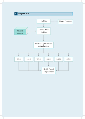 B. Diagram Alir Segitiga Materi Prasyarat Unsur-Unsur Masalah Segitiga Otentik Perbandingan Sisi-Sisi dalam Segitiga sin α cos α tan α sec α cosec α cot α Grafik Fungsi Trigonometri