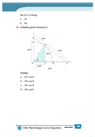 Jika AD = a, hitung: a. AC b. DC 10. Perhatikan gambar di bawah ini. E cot θ F D csc θ tan θ 1 sin θ θ O A B C cos θ sec θ Buktikan a. OC = sec θ b. CD = tan θ c. OE = csc θ d. DE = cot θ Matematika 153