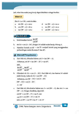 c. Dari Sifat 4.3, kita ketahui bahwa tan A = cot (90 – A), dan sin A = cos