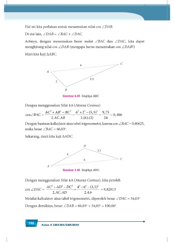 Dengan bantuan kalkulator atau tabel trigonometri, karena cos ∠BAC = 0,40625,