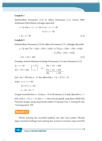 Jadi, nilai x = 22, y = 11, dan z = 7 atau banyak pupuk yang harus dibeli Pak