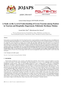 Politeknik Merlimau, Melaka. The findings of this research indicated a high level of understanding of green tourism among Tourism and Hospitality students in
