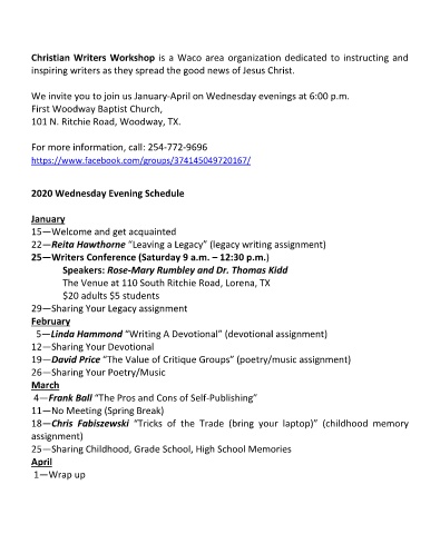 Christian Writers Workshop is a Waco area organization dedicated to instructing and