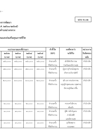 ที่ โครงการ/กิจกรรม วัตถุประสงค (ผลผลิตของโครงการ) ๒๕๖๑ ๒๕๖๒ ๒๕๖๓ ๒๕๖๔ ๒๕๖๕ (KPI) จะไดรับ รับผิดชอบ