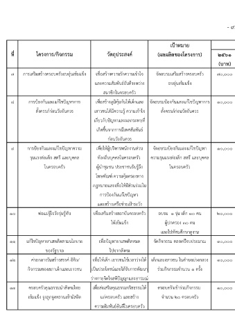 9 การปองกันและแกไขปญหาความ เพื่อใหผูบริหารพนักงานสวน จัดอบรมปองกันและแกไขปญหา 10,000 10,000 10,000 10,000 10,000 จํานวนครั้ง ชุมชนปราศจากปญหาการใช สํานักปลัด