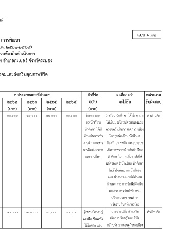 ที่ โครงการ/กิจกรรม วัตถุประสงค (ผลผลิตของโครงการ) ๒๕๖๑ ๒๕๖๒ ๒๕๖๓ ๒๕๖๔ ๒๕๖๕ (KPI) จะไดรับ รับผิดชอบ