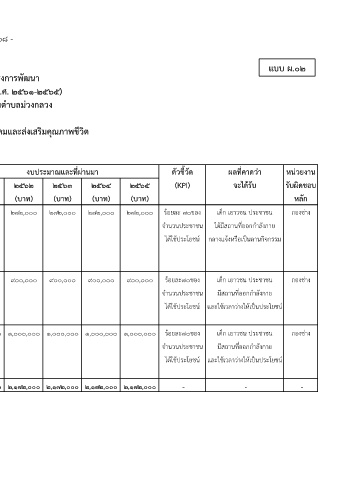 ที่ โครงการ/กิจกรรม วัตถุประสงค (ผลผลิตของโครงการ) ๒๕๖๑ ๒๕๖๒ ๒๕๖๓ ๒๕๖๔ ๒๕๖๕ (KPI) จะไดรับ รับผิดชอบ