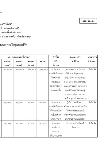 ที่ โครงการ/กิจกรรม วัตถุประสงค (ผลผลิตของโครงการ) ๒๕๖๑ ๒๕๖๒ ๒๕๖๓ ๒๕๖๔ ๒๕๖๕ (KPI) จะไดรับ รับผิดชอบ
