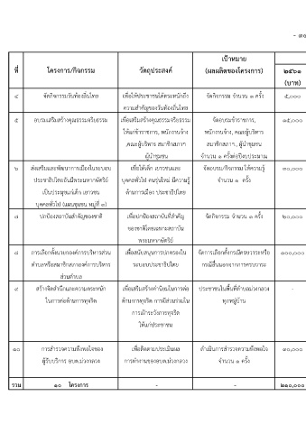 7 ปกปองสถาบันสําคัญของชาติ เพื่อปกปองสถาบันที่สําคัญ จัดกิจกรรม จํานวน 1 ครั้ง 20,000 20,000 20,000 20,000 20,000 จํานวนครั้ง ประชาชนเกิดความรูสึกรัก สํานักปลัด