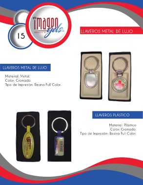 LLAVEROS METAL DE LUJO 15 LLAVEROS METAL DE LUJO Material: Metal. Color: Cromado. Tipo de Impresión: Resina Full Color. LLAVEROS PLÁSTICO Material: Plástico Color: Cromado. Tipo de Impresión: Resina Full Color.
