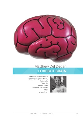 Matthew Del Degan LOVEBOT BRAIN Our brains are more circuitry, speeding thoughts in this city: Life is a series Yes or No? Zeroes and ones Choices in love and fear. This is Lovebot Brain. THE BRAIN PROJECT 2 0 1 6 29