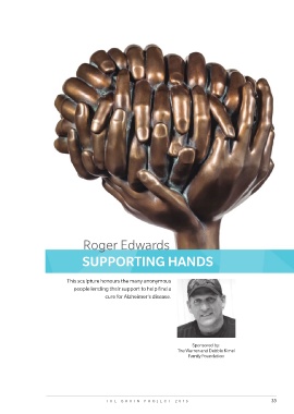 Roger Edwards SUPPORTING HANDS This sculpture honours the many anonymous people lending their support to help fi nd a cure for Alzheimer’s disease. Sponsored by: The Warren and Debbie Kimel Family Foundation THE BRAIN PROJECT 2 0 1 6 33