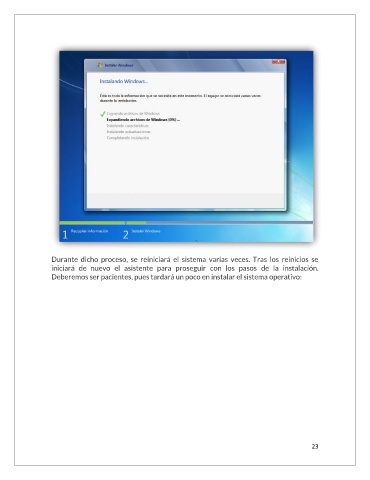Durante dicho proceso, se reiniciará el sistema varias veces. Tras los reinicios se iniciará de nuevo el asistente para proseguir con los pasos de la instalación. Deberemos ser pacientes, pues tardará un poco en instalar el sistema operativo: 23