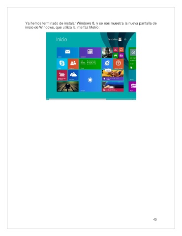 Ya hemos terminado de instalar Windows 8, y se nos muestra la nueva pantalla de inicio de Windows, que utiliza la interfaz Metro: 40