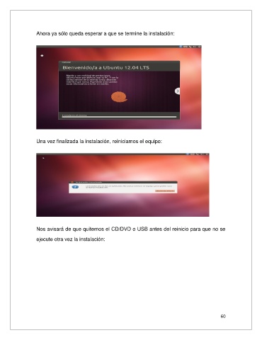 Ahora ya sólo queda esperar a que se termine la instalación: Una vez finalizada la instalación, reiniciamos el equipo: Nos avisará de que quitemos el CD/DVD o USB antes del reinicio para que no se ejecute otra vez la instalación: 60