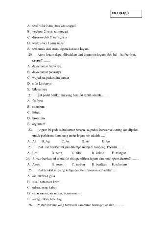 25. Zat berikut ini yang ketiganya merupakan unsur adalah…..