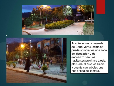 Aquí tenemos la plazuela de Cerro Verde, como se puede apreciar es una zona de distracción y de encuentro para los habitantes próximos a esta plazuela, el área es limpia, y cuenta con arboles que nos brinda su sombra.