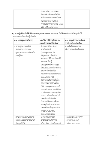 ๖). การปฏิบัติงานให้เข้ากับระบบ (System-based Practice) จัดให้แพทย์ประจําบ้านทุกชั้นปีมี ประสบการณ์การเรียนรู้เกี่ยวกับ