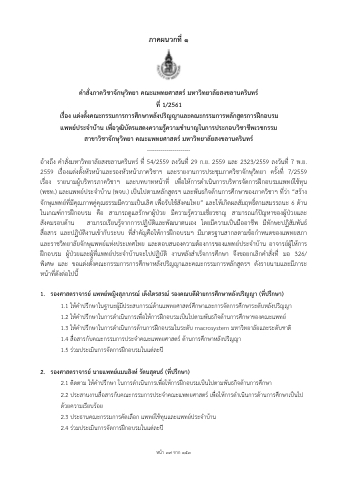 อ้างถึง คําสั่งมหาวิทยาลัยสงขลานครินทร์ ที่ 54/2559 ลงวันที่ 29 ก.ย. 2559 และ 2323/2559 ลงวันที่ 7 พ.ย. 2559 เรื่องแต่งตั้งหัวหน้าและรองหัวหน้าภาควิชาฯ และรายงานการประชุมภาควิชาจักษุวิทยา ครั้งที่ 7/2559 เรื่อง รายนามผู้บริหารภาควิชาฯ และบทบาทหน้าที่ เพื่อให้การดําเนินการบริหารจัดการฝึกอบรมแพทย์ใช้ทุน (พชท.) และแพทย์ประจําบ้าน (พจบ.) เป็นไปตามหลักสูตรฯ และพันธกิจด้านการศึกษาของภาควิชาฯ ที่ว่า “สร้าง จักษุแพทย์ที่มีคุณภาพคู่คุณธรรมมีความเป็นเลิศ เพื่อรับใช้สังคมไทย” และให้เกิดผลสัมฤทธิ์ตามสมรรถนะ 6 ด้าน ในเกณฑ์การฝึกอบรม คือ สามารถดูแลรักษาผู้ป่วย มีความรู้ความเชี่ยวชาญ สามารถแก้ปัญหาของผู้ป่วยและ สังคมรอบด้าน สามารถเรียนรู้จากการปฏิบัติและพัฒนาตนเอง โดยมีความเป็นมืออาชีพ มีทักษะปฏิสัมพันธ์ สื่อสาร และปฏิบัติงานเข้ากับระบบ ที่สําคัญคือให้การฝึกอบรมฯ มีมาตรฐานสากลตามข้อกําหนดของแพทยสภา และราชวิทยาลัยจักษุแพทย์แห่งประเทศไทย และตอบสนองความต้องการของแพทย์ประจําบ้าน อาจารย์ผู้ให้การ ฝึกอบรม ผู้ป่วยและผู้ที่แพทย์ประจําบ้านจะไปปฏิบัติ งานหลังสําเร็จการศึกษา จึงขอยกเลิกคําสั่งที่ มอ 326/ พิเศษ และ ขอแต่งตั้งคณะกรรมการการศึกษาหลังปริญญาและคณะกรรมการหลักสูตรฯ ดังรายนามและมีภาระ หน้าที่ดังต่อไปนี้
