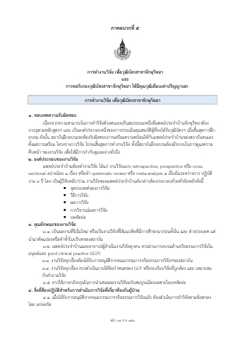 แพทย์ประจําบ้านต้องทํางานวิจัย ได้แก่ งานวิจัยแบบ retrospective, prospective หรือ cross sectional อย่างน้อย ๑ เร่ือง หรือทํา systematic review หรือ meta-analysis ๑ เรื่องในระหว่างการ ปฏิบัติ งาน ๓ ปี โดย เป็นผู้วิจัยหลัก/ร่วม งานวิจัยของแพทย์ประจําบ้านดังกล่าวต้องประกอบด้วยหัวข้อหลักดังน้ี
