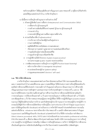 แผน ก (แพทย์ประจําบ้าน) แพทย์ฝึกอบรม แผน ข (แพทย์ใช้ทุน) ให้ได้ประสบการณ์การเรียนรู้ที่สอดคล้องกับ ผลลัพธ์การฝึกอบรมที่พึงประสงค์ การอบรมมีการกํากับดูแลอย่างเป็นระบบ มีคณะกรรมการการศึกษาหลัง ปริญญาและคณะกรรมการหลักสูตรฯ และคณะกรรมการปรับปรุงหลักสูตรฯ (ภาคผนวกที่ ๑ และ ๒) ที่มี คณาจารย์ที่มีประสบการณ์ มีความเชี่ยวชาญด้านการศึกษาร่วมบริหารการฝึกอบรมให้เป็นไปตามพันธกิจ การอบรมในแผน ก จะใช้เวลาเรียนอย่างต่ํา ๓ ปี และการอบรมในแผน ข จะใช้เวลาเรียนอย่างต่ํา ๔ ปี (ไม่นับ เวลาเพิ่มพูนทักษะ ๑ ปี) จัดการสอนภาคทฤษฎีและภาคปฏิบัติโดย ใช้วิธีการปฏิบัติเป็นฐาน (practice-based training) ให้ผู้เรียนมีส่วนร่วมในการบริบาล และรับผิดชอบผู้ป่วย มีการบูรณาการภาคทฤษฎีกับภาคปฏิบัติ การ อบรมเน้นให้ผู้เข้ารับการฝึกอบรมได้สะท้อนการเรียนรู้นั้นๆ (self-reflection) มีการกํากับดูแล (supervision) และการให้ข้อมูลป้อนกลับ (feedback) อย่างเป็นระบบ ภาควิชาได้กําหนดเป้าประสงค์หลักของการอบรมใน แต่ละช่วงชั้นปีตาม milestone ของราชวิทยาลัยฯ ดังภาคผนวกที่ ๖ และมีการติดตามตรวจสอบกํากับดูแล (supervision) และให้ข้อมูลป้อนกลับ (feedback) แก่แพทย์ประจําบ้าน ซึ่งใช้การประเมินการทําหัตถการ (direct observe procedural skills, DOPS) และการประเมินองค์รวม (entrustable professional activities, EPA) ดังภาคผนวกที่ ๔ เพื่อนํามาพัฒนาปรับปรุงอย่างสม่ําเสมอ โดยมีการให้การอบรมเน้นบูรณาการการเรียนรู้ ภาค ทฤษฎีกับภาคปฏิบัติและการส่งเสริมการพัฒนาการเรียนรู้ด้วยตนเอง ภาควิชาฯ จัดให้ผู้เข้ารับการฝึกอบรม เรียนในหลักสูตรประกาศนียบัตรบัณฑิตชั้นสูง สาขาวิชาวิทยาศาสตร์การแพทย์คลินิก (รหัสหลักสูตร:
