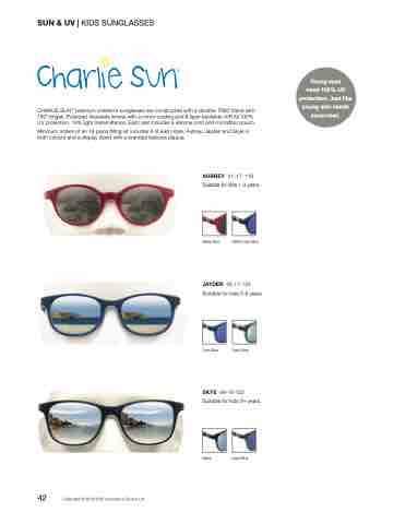 CHARLIE SUNTM premium children’s sunglasses are constructed with a durable TR90 frame with 180˚ hinges. Polarized triacetate lenses with a mirror coating and 8 layer backside A/R for100% UV protection, 18% light transmittance. Each pair includes a silicone cord and microfiber pouch.