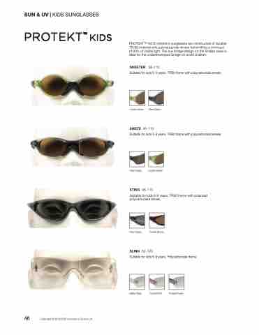 PROTEKTTM KIDS children’s sunglasses are constructed of durable TR-90 material with polycarbonate lenses transmitting a minimum of 80% of visible light. The low bridge design on the smaller sizes is ideal for the underdeveloped bridge on small children.