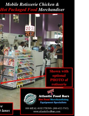 HH Series Mobile Rotisserie Chicken & 25-½” D x 58” H Hot Packaged Food Merchandiser Shown with optional PHOTO of rotisserie Sets up to serve 2 express checkout lanes