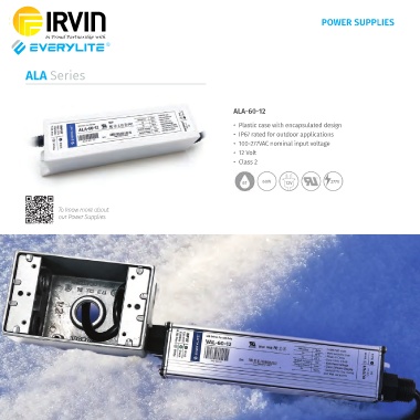 POWER SUPPLIES in Proud Partnership with ALA Series ALA-60-12 • Plastic case with encapsulated design • IP67 rated for outdoor applications • 100-277VAC nominal input voltage • 12 Volt • Class 2 To know more about our Power Supplies