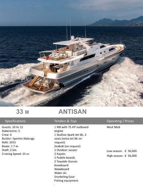 Cruising Speed: 25 KN 2 Kayaks High season: € 56,000