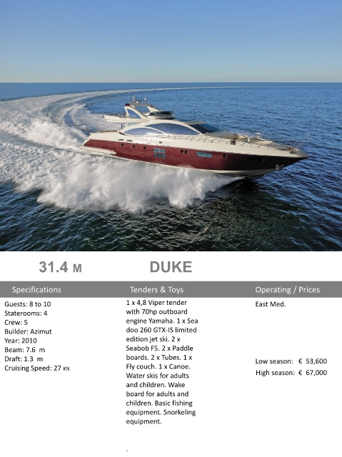 Cruising Speed: 27 KN Fly couch. 1 x Canoe. High season: € 67,000