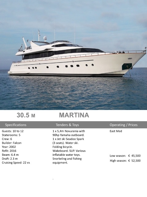 Beam: 6.4 m inflatable water toys. Low season: € 45,500