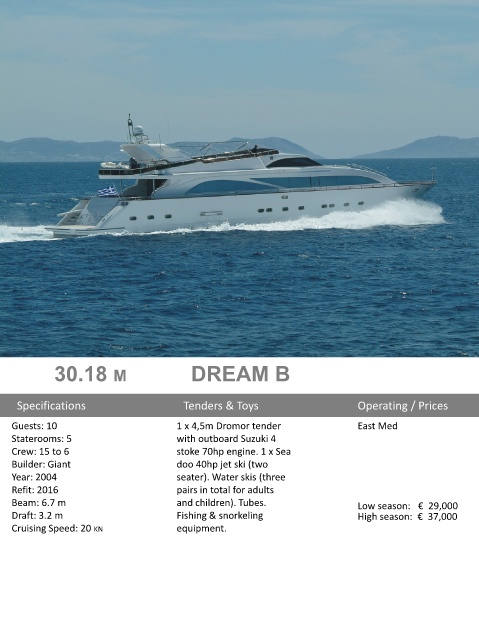 Draft: 3.2 m Fishing & snorkeling High season: € 37,000