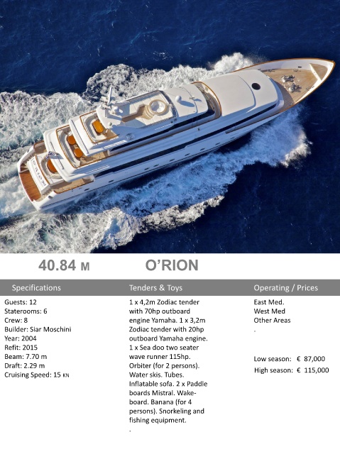 Draft: 2.29 m Orbiter (for 2 persons). High season: € 115,000