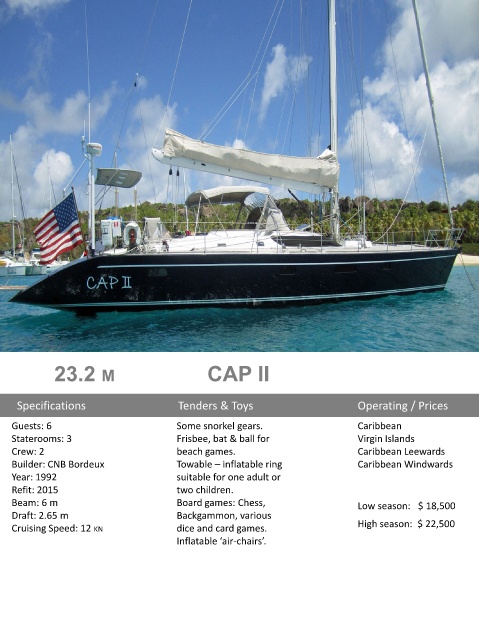 Cruising Speed: 12 KN dice and card games. High season: $ 22,500