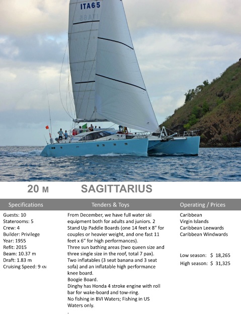 Beam: 10.37 m three single size in the roof, total 7 pax). Low season: $ 18,265