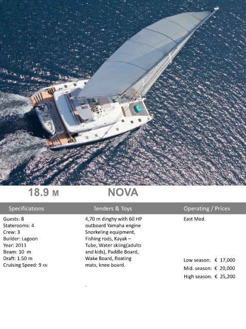 Cruising Speed: 9 KN mats, knee board. Mid. season: € 20,000
