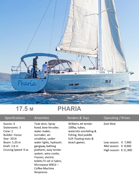 Cruising Speed: 9 KN platform, easy tender High season: € 11,900