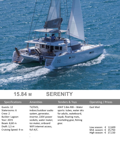 Cruising Speed: 9 KN full A/C. Mid. season: € 15,750