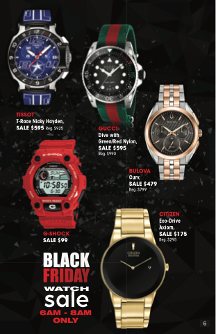TISSOT T-Race Nicky Hayden, SALE $595 Reg. $925 GUCCI Dive with Green/Red Nylon, SALE $595 Reg. $990 Curv, SALE $479 Reg. $799 Axiom, SALE $175 Reg. $295 G-SHOCK SALE $99 sale WATCH 6AM - 8AM ONLY 6 BULOVA CITIZEN Eco-Drive