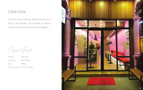 CHA CHA Cha Cha is one of the tea shop located near to Phsar Chas Market. We decided to choose colorful to make it more fancy and brighter. Project Brief Project: Cha Cha Location: Siem Reap Type: Office Scope of work: Interior Design 49